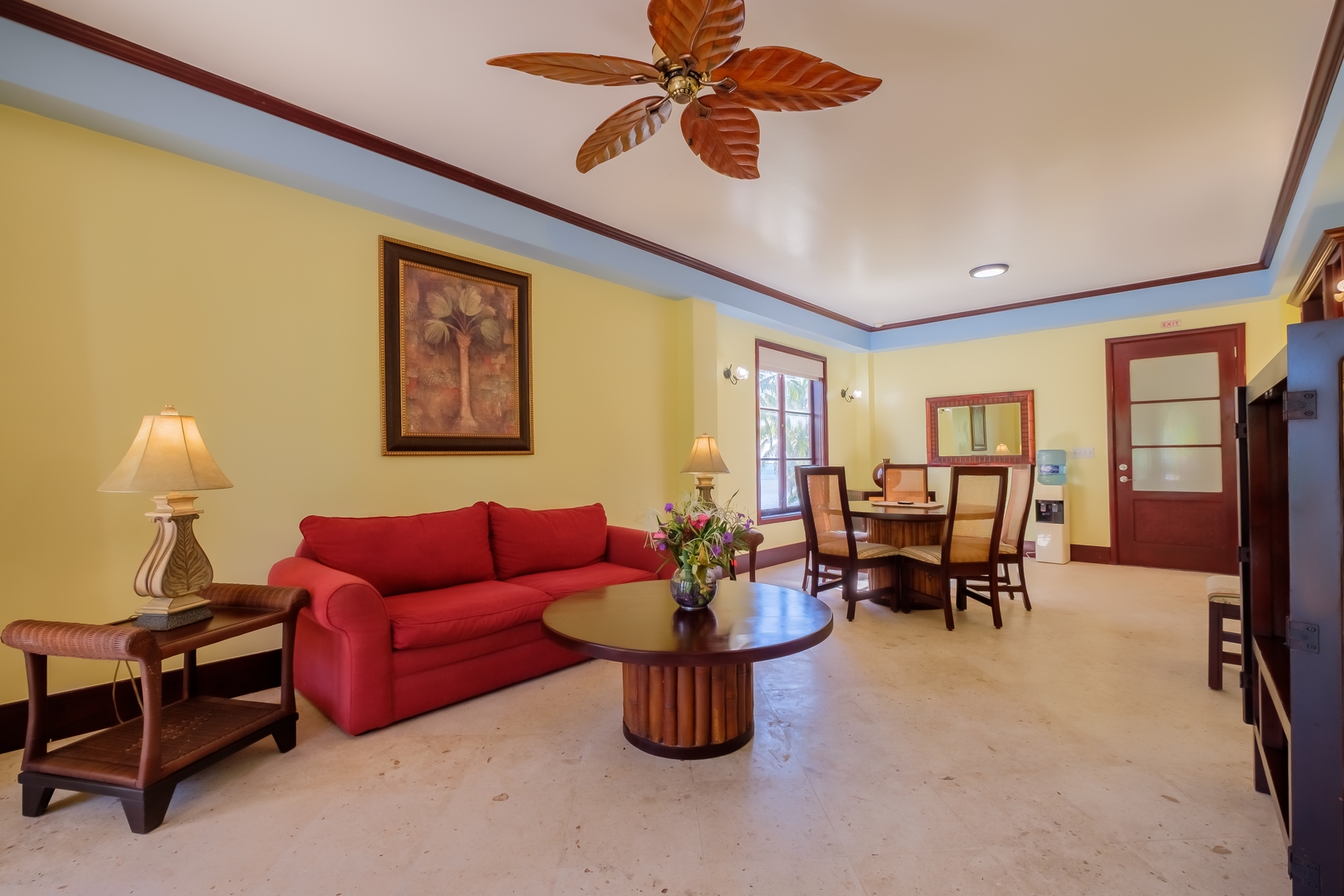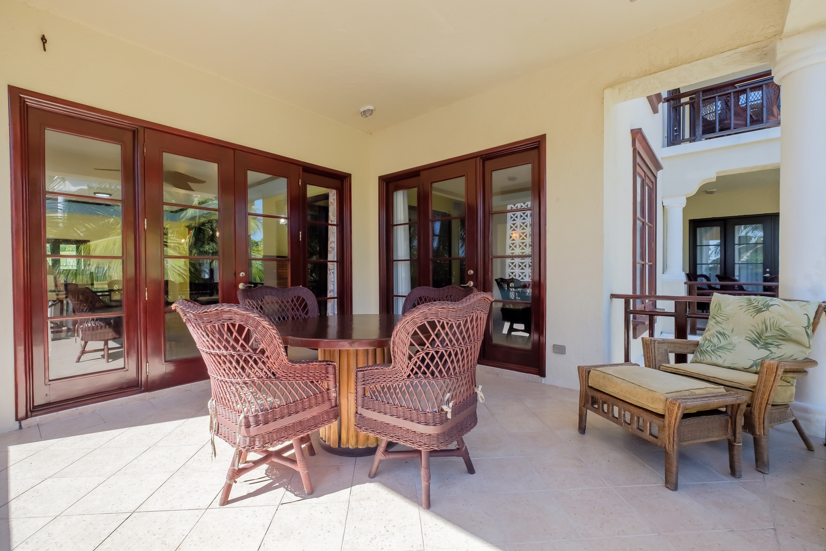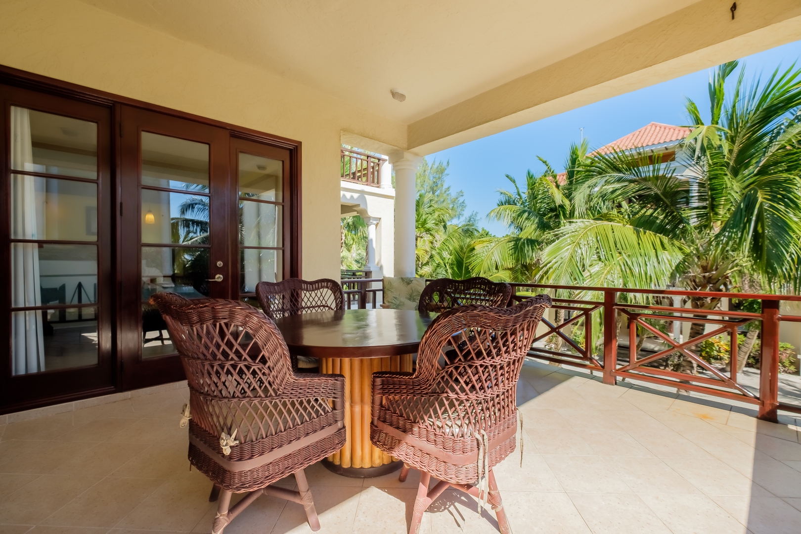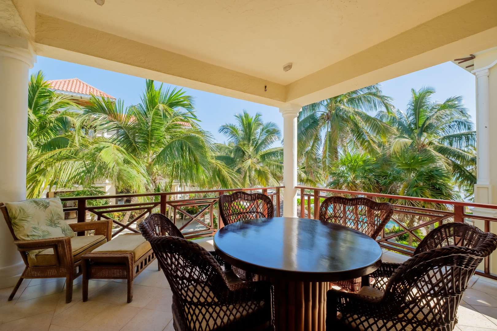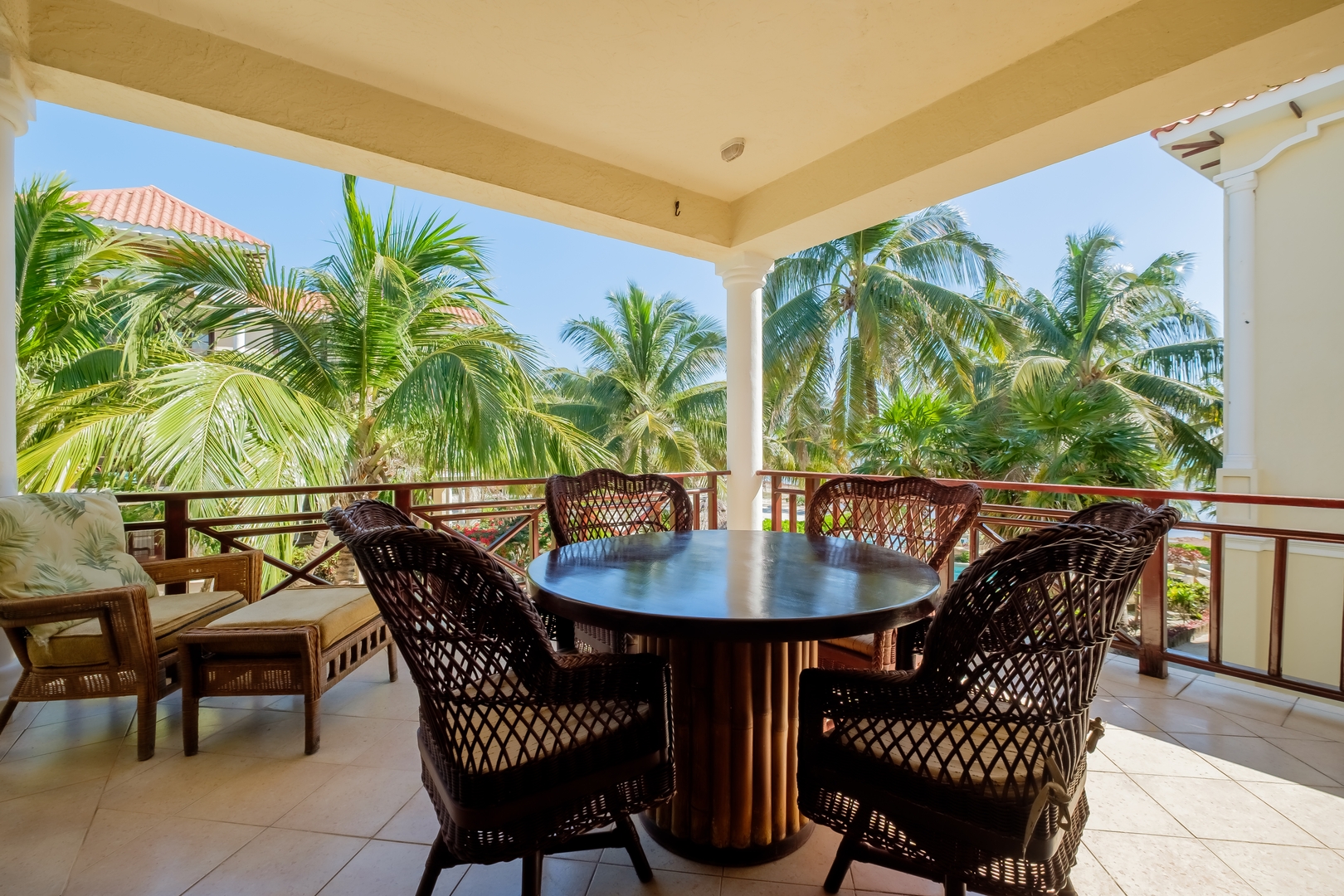 The fully equipped kitchen includes stainless steel appliances, generous counter space, and open shelving stocked with all the essentials for preparing your favorite meals. Enjoy dining at the comfortable table for four or step out onto your private balcony with outdoor seating to take in the gentle sea breeze and lush tropical surroundings.